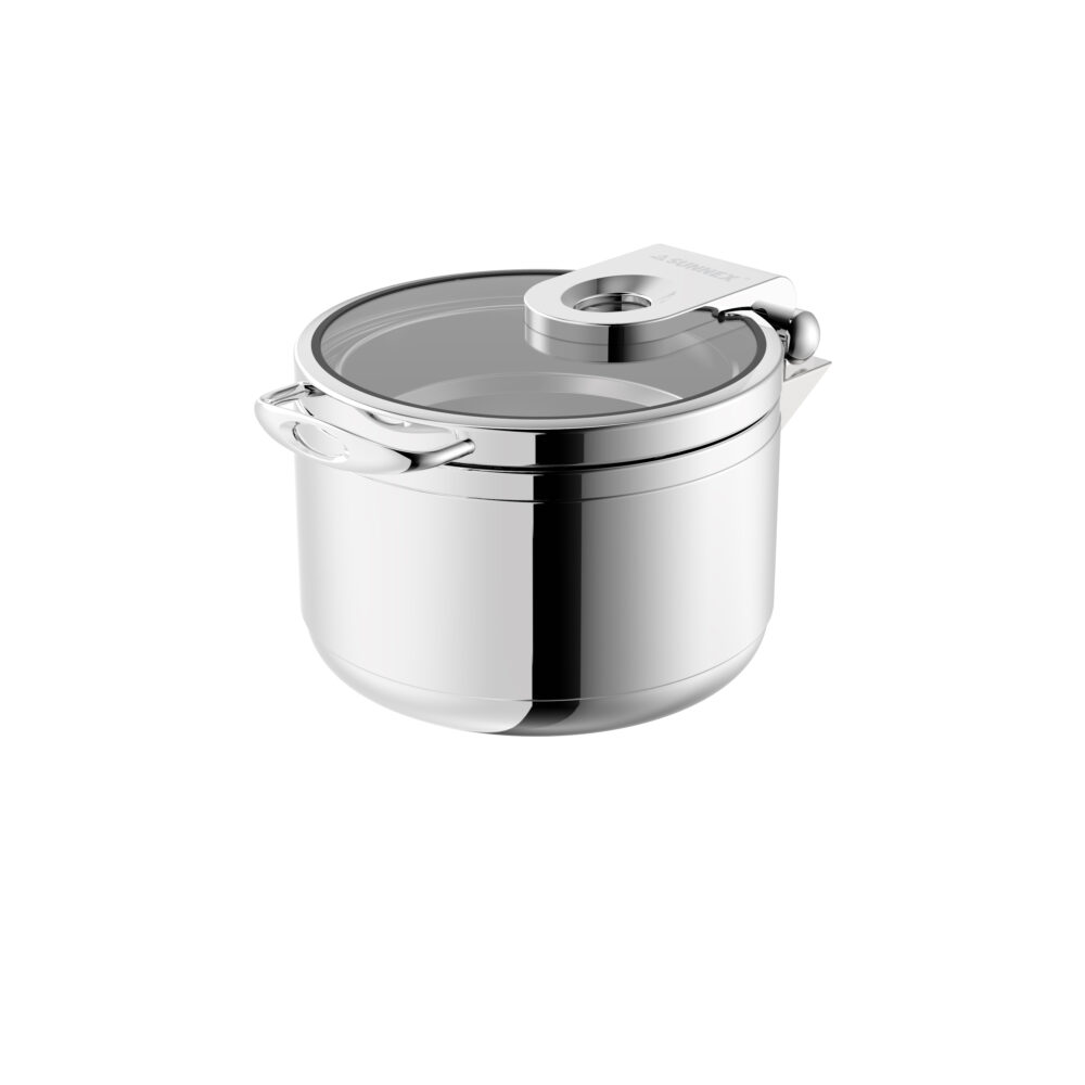 This full size induction chafer is simple and stylish. The dome glass window with air vent keeps condensation to minimum level. The lid is removable for cleaning. The hydraulic hinge can keep the lid open at 90 degree, but allow slow and quiet closing. Each full size chafer includes a 8.5L food pan, a water pan and glass lid. Water pan is acted as base of chafer, good for induction warming.