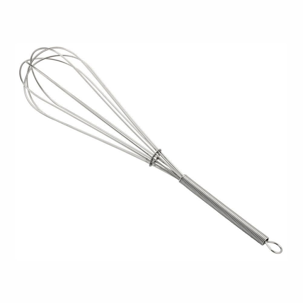 This stainless steel piano whisk is ideal for whipping of lighter sauces and batter. Its thin wire beats a large amount of air into egg whites, heavy cream, and other liquids. Made of stainless steel.