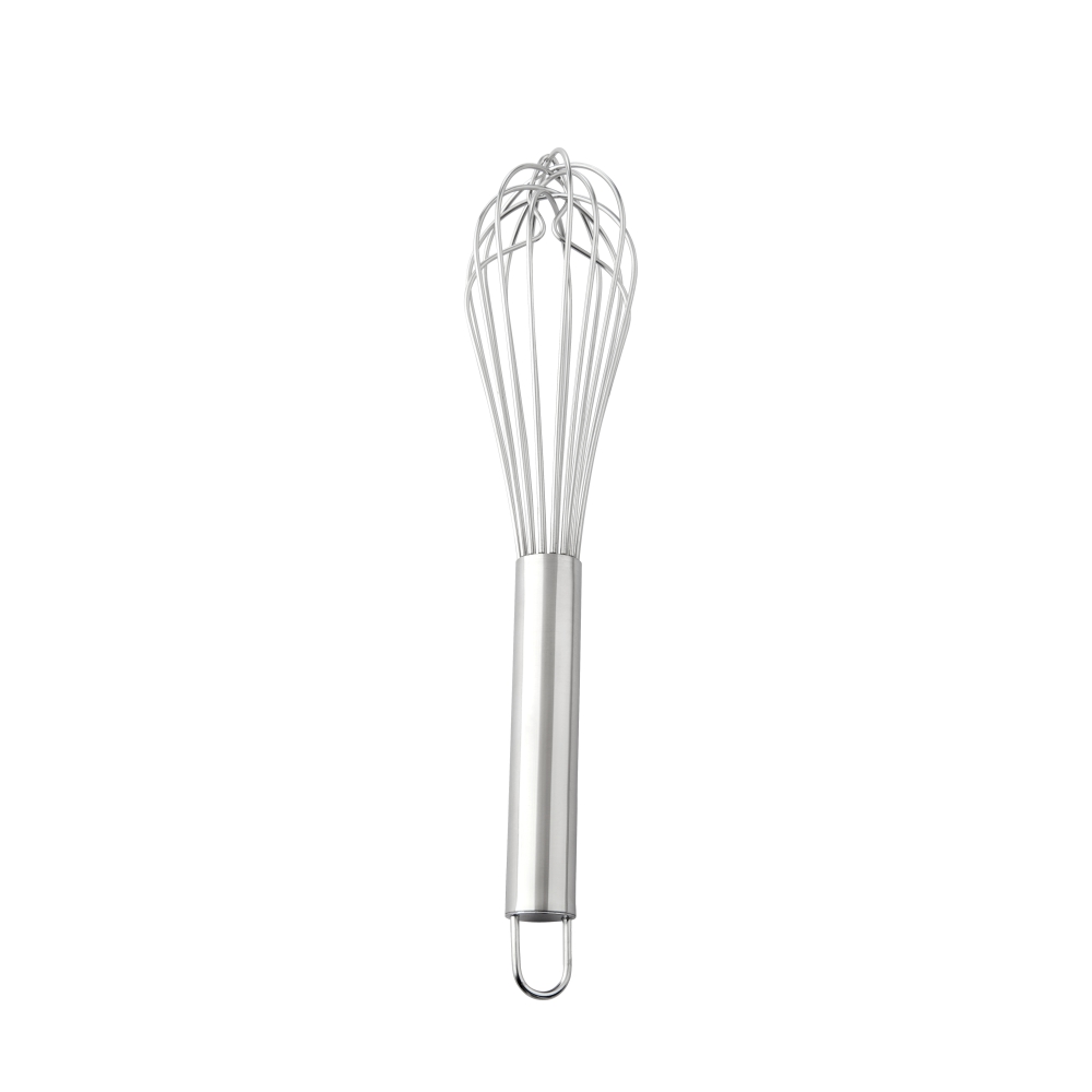 This stainless steel French whisk is built sturdy for stirring up thick batters. Designed with ergonomic handle. Made of 18/8 stainless steel, this whisk is durable and sturdy. Hook at end of handle for easy drying and storage.