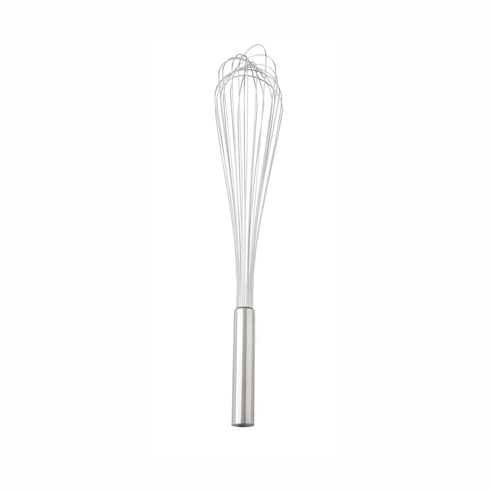 This stainless steel piano whisk is ideal for whipping of lighter sauces and batter. Its thin wire beats a large amount of air into egg whites, heavy cream, and other liquids. Designed with ergonomic handle. Made of 18/8 stainless steel, this whisk is durable and sturdy.