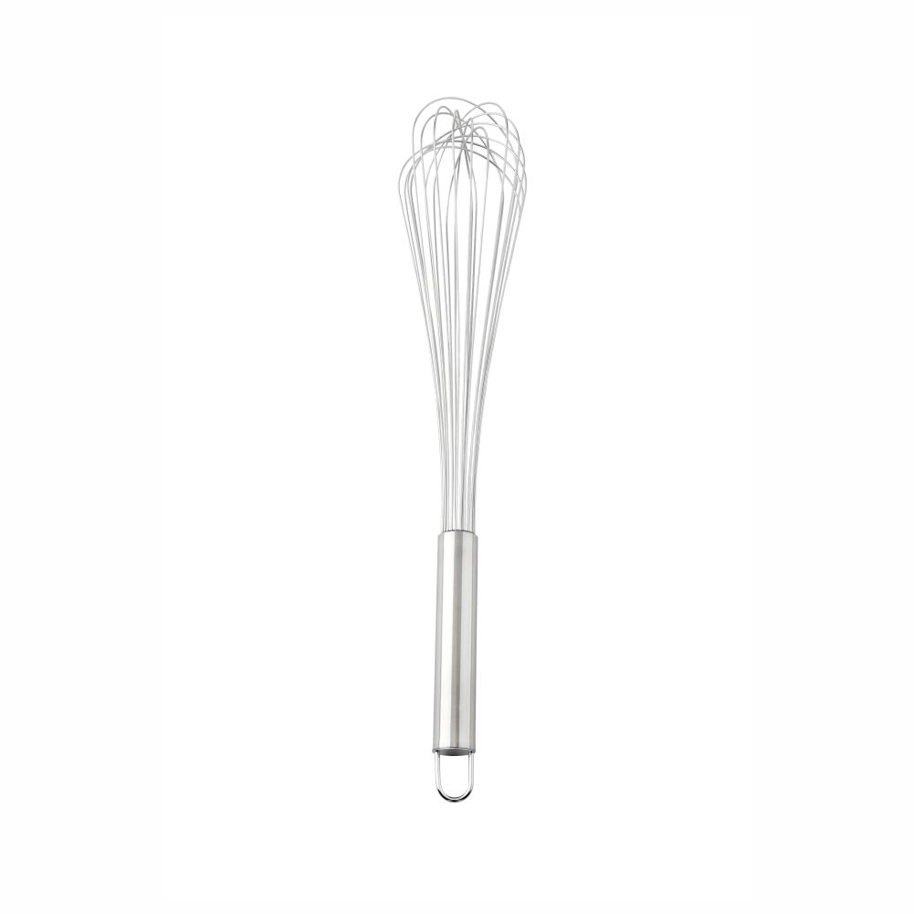 This stainless steel piano whisk is ideal for whipping of lighter sauces and batter. Its thin wire beats a large amount of air into egg whites, heavy cream, and other liquids. Designed with ergonomic handle. Made of 18/8 stainless steel, this whisk is durable and sturdy. Hook at end of handle for easy drying and storage.
