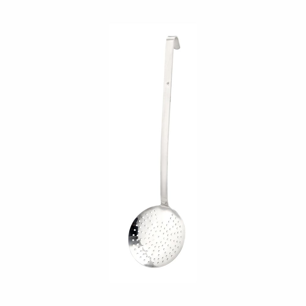 This skimmer is a great tool for your kitchen. The one-piece stainless steel construction provides durability for commercial enviroment. The skimmer has a 54cm long handle that is ideal for using with deep container, while keeping your hands away from content. The hook at the end of handle adds convenience in hanging and drying. The bowl in diameter 16cm allows water and grease to drain out easily.