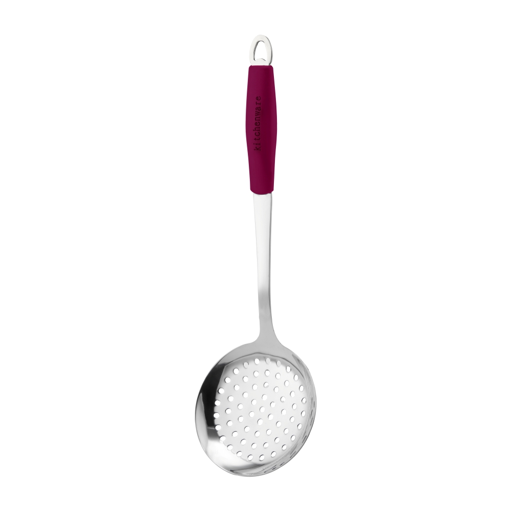 The purple silicone handled skimmer stands out among other kitchen tools. The skimmer head is made of stainless steel for durability. The holes in the bowl allow water and grease to drain out easily. The silicone handle is non slip and it keeps your hand away from heat. The hole on handle enables easy hanging and storage.