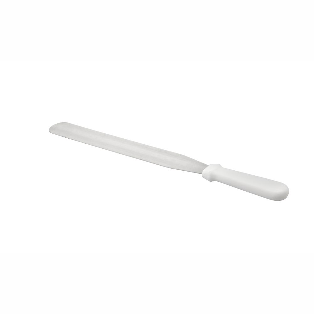 This spatula is perfect for spreading icing onto a cake or pushing batter into an even layer in a pan. The stainless steel blade is durable and easy to clean. The spatula features a white polypropylene handle that ensures a comfortable and secure grip.