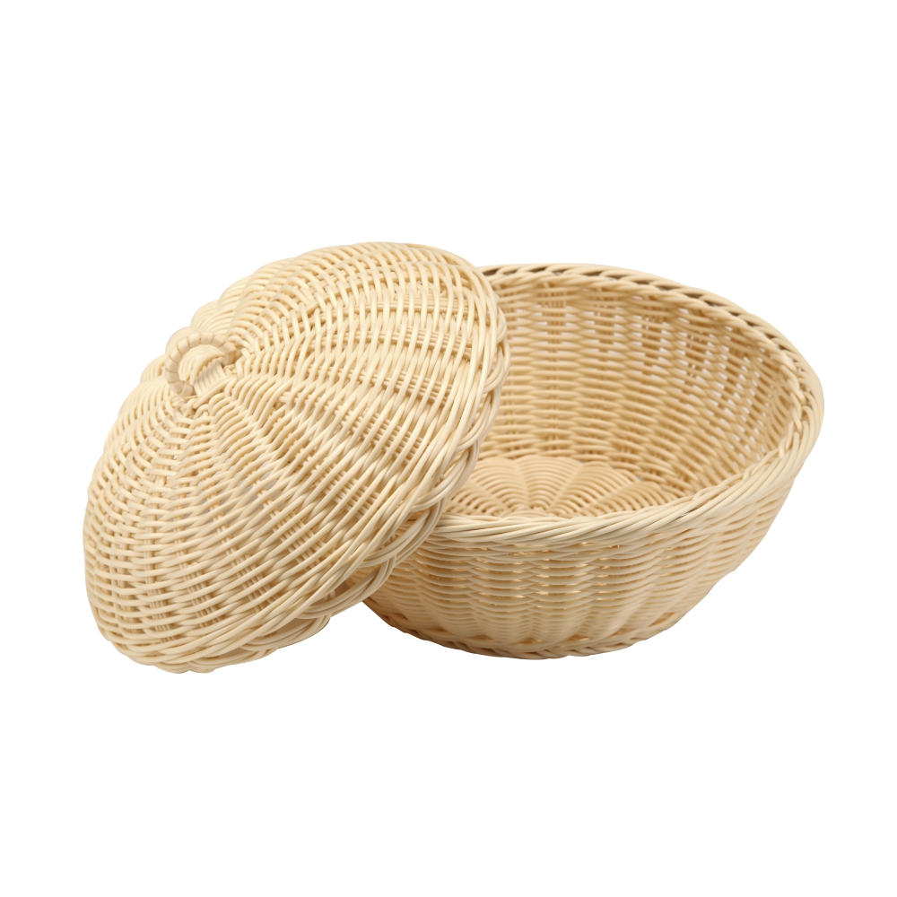 Heavy Duty Polypropylene Rattan Basket with Cover, Round, dia.27.5x10cm, Beige (C06 Series)
